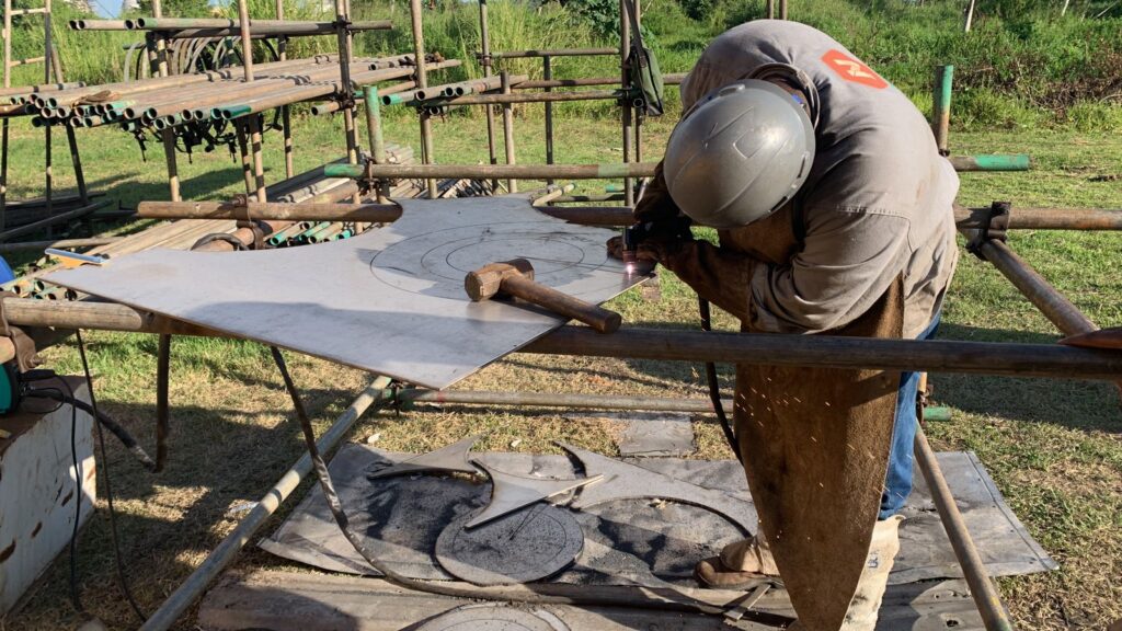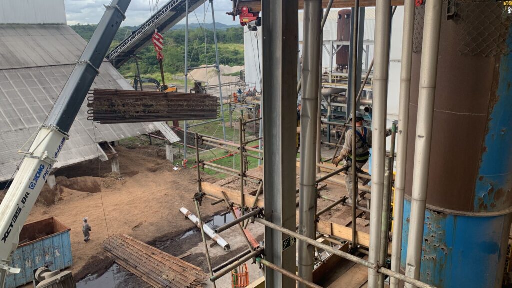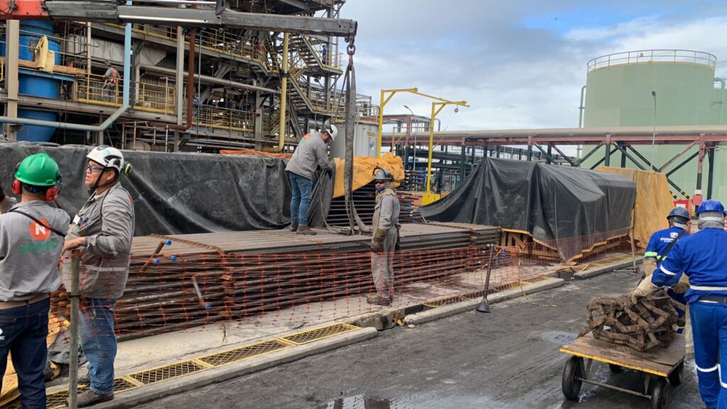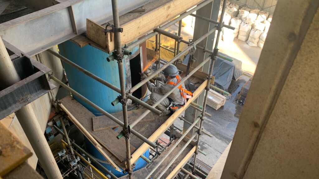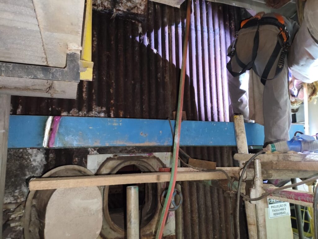Segurança é uma prioridade absoluta no projeto da INOMEC. Os trabalhadores utilizam equipamentos de proteção individual, como capacetes, luvas e coletes, além de contar com andaimes bem estruturados para realizar as tarefas em altura. Essa dedicação à segurança não só protege a equipe, mas também assegura que o trabalho seja concluído sem incidentes, mantendo os mais altos padrões de qualidade e respeitando as normas vigentes no setor industrial.